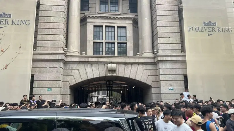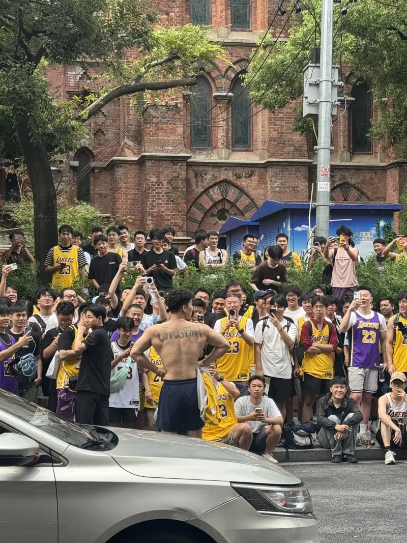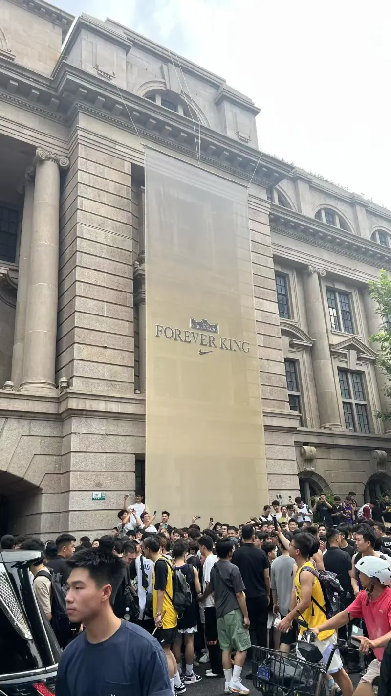 根据现场球迷返图,在上海当地的第二场活动开始之前,外滩建筑群附近的大楼已经挂上詹姆斯中国行“Forever King”的条幅。有狂热球迷脱下衣服,露出背部“Chosen 1”(天选之子)的纹身,引起现场球迷关注。该字样在今早刚披露的一双Lebron 23“The Chosen One and the One Who Chose”中也有相关设计。